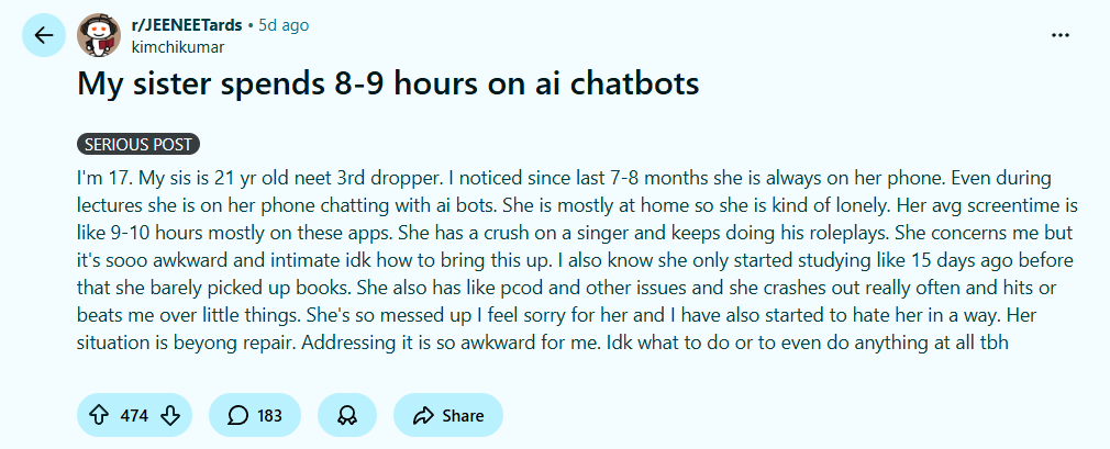 “Even during lectures she is on her phone chatting with ai bots. She is mostly at home so she is kind of lonely. Her avg screentime is like 9-10 hours mostly on these apps.”, the user expressed.